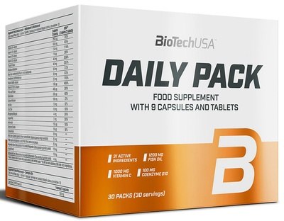Если Вы привыкший следить за своим здоровьем человек, Ваша жизнь тесно связана со спортом, требование к витаминно-минеральным комплексам существенно возрастает. Как определить суточную дозу витаминов и минералов, если Вы активно занимаетесь спортом? Наши биоинженеры создали для Вас уникальный комплекс мультивитаминов и микроэлементов в одном пакетике (PAK). Daily Pack от BioTech USA – великолепно сбалансированный комплекс витаминов, микроэлементов и других необходимых веществ, специально разработанный для Вас. Более того Daily Pack намного превосходит мультивитамины «в одной таблетке» и по количеству, и по разнообразию питательных веществ. Поэтому, если Вам нужно что-то исключительное, выбирайте Daily Pack. Daily Pack от BioTechUSA имеет идеально сбалансированный состав витаминов и минералов, оптимальную суточную дозу необходимых организму полезных элементов. Благодаря тщательно подобранной витаминно-минеральной формуле и удобной форме фасовки, Вам не нужно будет самостоятельно подсчитывать необходимую норму отдельных компонентов, все уже сделано для Вас профессионалами. Daily Pack — Ваш ежедневный природный источник сил, здоровья и отличного самочувствия.